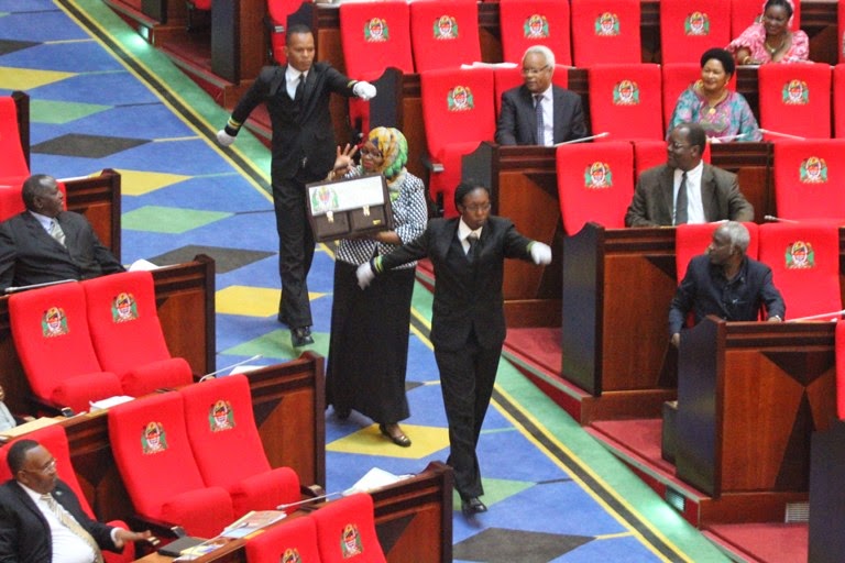 Waziri wa Fedha Saada Mkuya Salum akisindikizwa na askari wa Bunge kwenda kusoma Bajeti ya Serikali kwa mwaka wa fedha 2014/2015 leo Bungeni mjini Dodoma.
